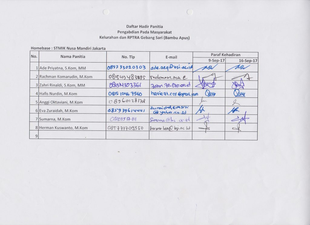 Hari Minggu, 10, 16 September 2017 telah dilaksanakan kegiatan pengabdian masyarakat pada Ruang Publik Terbuka Ramah Anak (RPTRA) Kelurahan GERBANG SARI ( BAMBU APUS) yang berlokasi di Jalan Gebang Sari, RT 02, RW 05, Kelurahan Bambu Apus, Kecamatan Cipayung, Jakarta Timur, Indonesia, Kode Pos 13890.