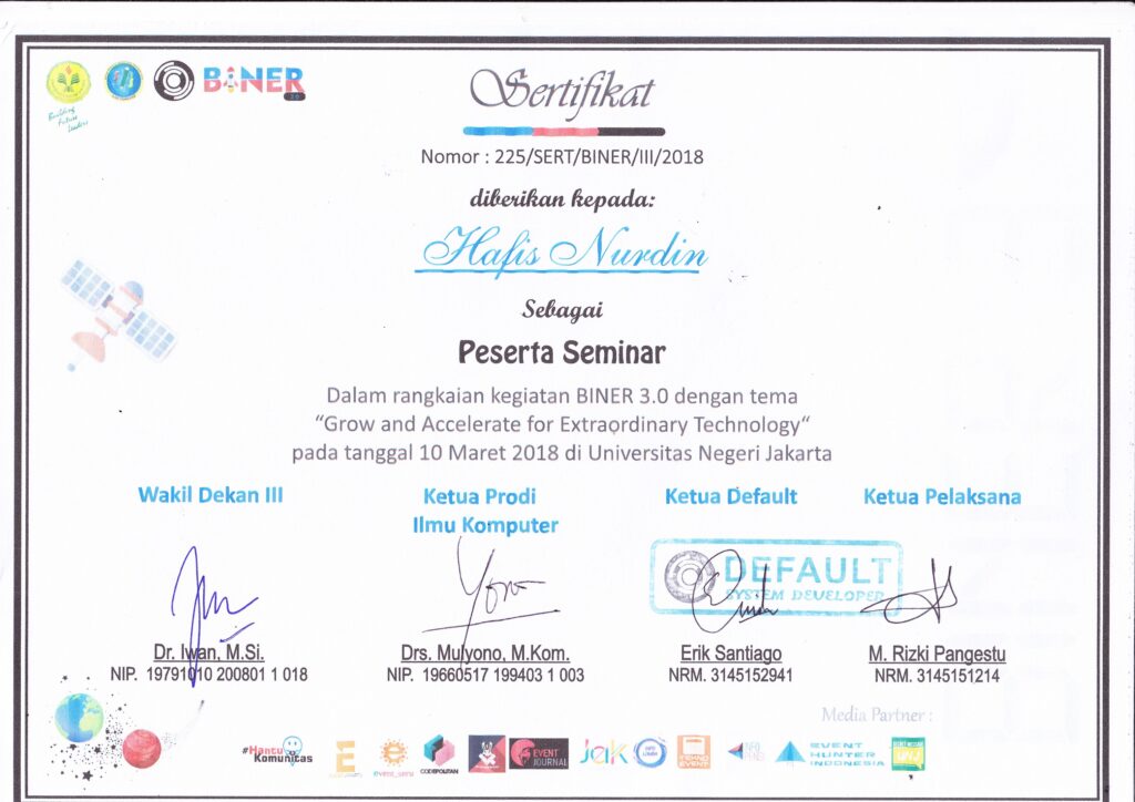Seminar BINER 3.0 ini diadakan di Gedung Dewi Sartika Lt.2 Aula Maftuchah Universitas Negeri Jakarta pada tanggal 10 Maret 2018. Dihadiri oleh M Asep Indrayana (Co-Founder & CEO Kelas Kita) dan Alfian Pamungkas Sakawiguna (CEO PT Cloud Hosting Indonesia) sebagai pembicara utama. Acara berlangsung dari jam 8 hingga jam 1 siang.