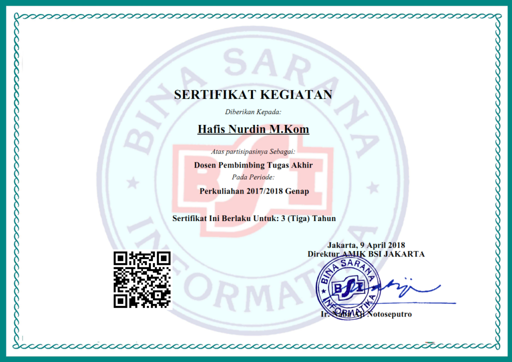 Sertifikat ini diberikan oleh Bina Sarana Informatika sebagai partisipasi sebagai Dosen Pembimbing Tugas Akhir periode perkuliahan 2017/2018 Genap yang berlaku selama 3 (Tiga) tahun.