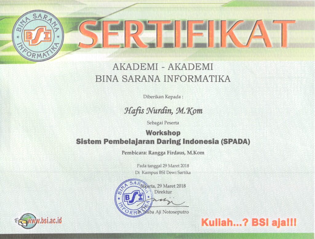 Workshop Sistem Pembelajaran Daring Indonesia (SPADA) diadakan oleh Bina Sarana Informatika pada tanggal 29 Maret 2018 dan bertempat di Kampus BSI Dewi Sartika. Pada workshop ini BSI mendatangkan pembicara Rangga Firdaus, M.Kom (Instruktur SPADA Indonesia Universitas Lampung) untuk memberikan paparan bagaimana Pembelajaran Daring dapat dilakukan secara optimal dalam penyampaian materi pembelajaran secara online.