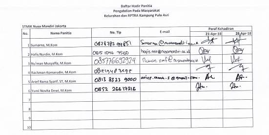 Hari Sabtu, 21 dan 28 April 2018 telah dilaksanakan kegiatan pengabdian masyarakat pada Ruang Publik Terbuka Ramah Anak (RPTRA) Kampung Pulo Kelurahan Pinang Ranti yang berlokasi Jl. Ridan No.63, RT.3/RW.5, Pinang Ranti, Makasar, Kota Jakarta Timur, Daerah Khusus Ibukota Jakarta 13560.