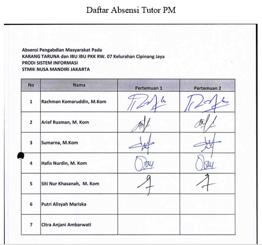 Untuk menunaikan salah satu Tri Dharma tersebut, pada hari Sabtu tanggal 22 & 29 September 2018 dossen program studi Sistem Informasi STMIK Nusa Mandiri telah melaksanakan kegiatan pengabdian masyarakat yang ditujukan kepada Karang Taruna dan Pengurus RW O7 Kelurahan Cipinang Besar Selatan Jakarta. Hal ini dilaksanakan berkaitan dengan kepedulian setiap lembaga atau institusi yang bergerak di bidang pendidikan, khususnya Pendidikan Tinggi dengan mengikuti perkembangan dan kemajuan teknologi.