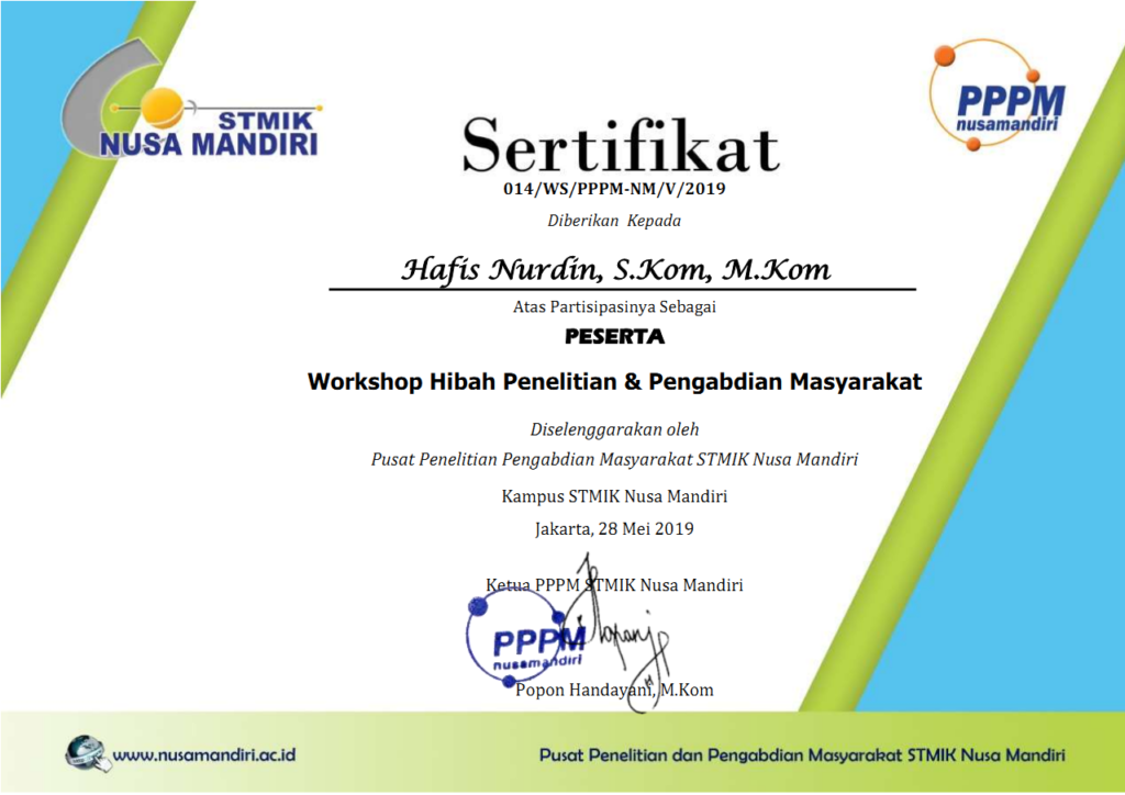 Workshop ini diadakan oleh PPPM STMIK Nusa Mandiri pada tanggal 28 Mei 2019 di Kampus STMIK Nusa Mandiri. Workshop ini berisikan info-info dan bagaimana mendapatkan Hibah Penelitian dan Pengabdian Masyarakat yang diberikan oleh pemerintah kepada setiap Dosen.