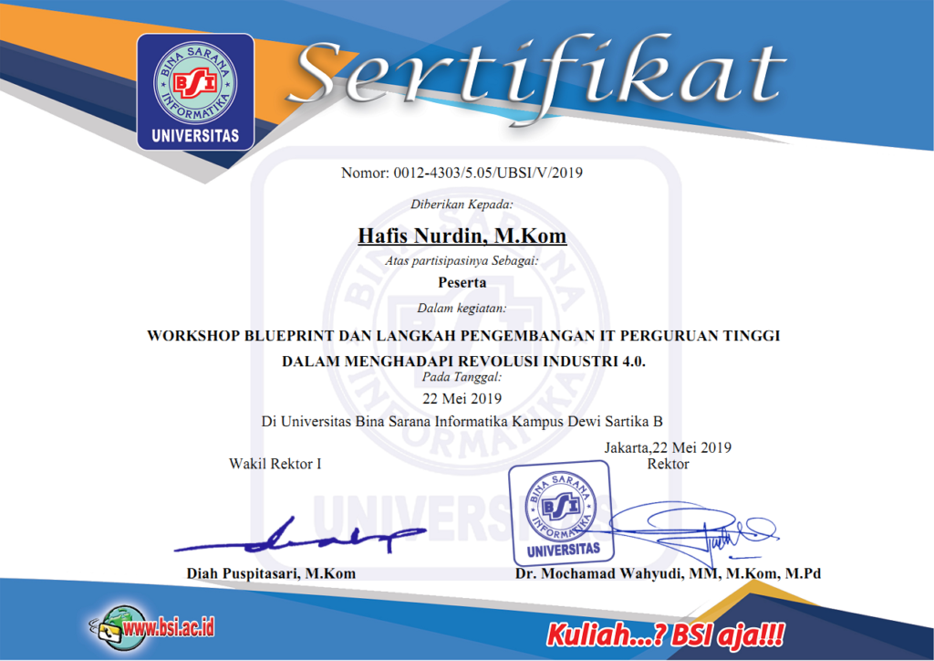 Workshop ini diadakan oleh Bina Sarana Informatika pada tanggal 22 Mei 2019 di Universitas Bina Sarana Informatika Kampus Dewi Sartika B. Workshop berisikan persiapan-persiapan dalam mengantisipasi kendala-kendala yang akan dihadapi di era revolusi industri 4.0.