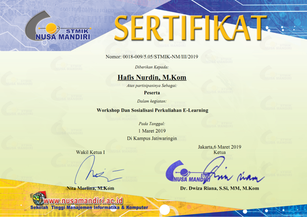 Workshop ini diadakan oleh STMIK Nusa Mandiri pada tanggal 1 Maret 2019 di Kampus Jatiwaringin. Acara workshop berisikan persiapan dan bagaimana dosen memberikan pembelajaran melalui Sistem E-Learning STMIK Nusa Mandiri.